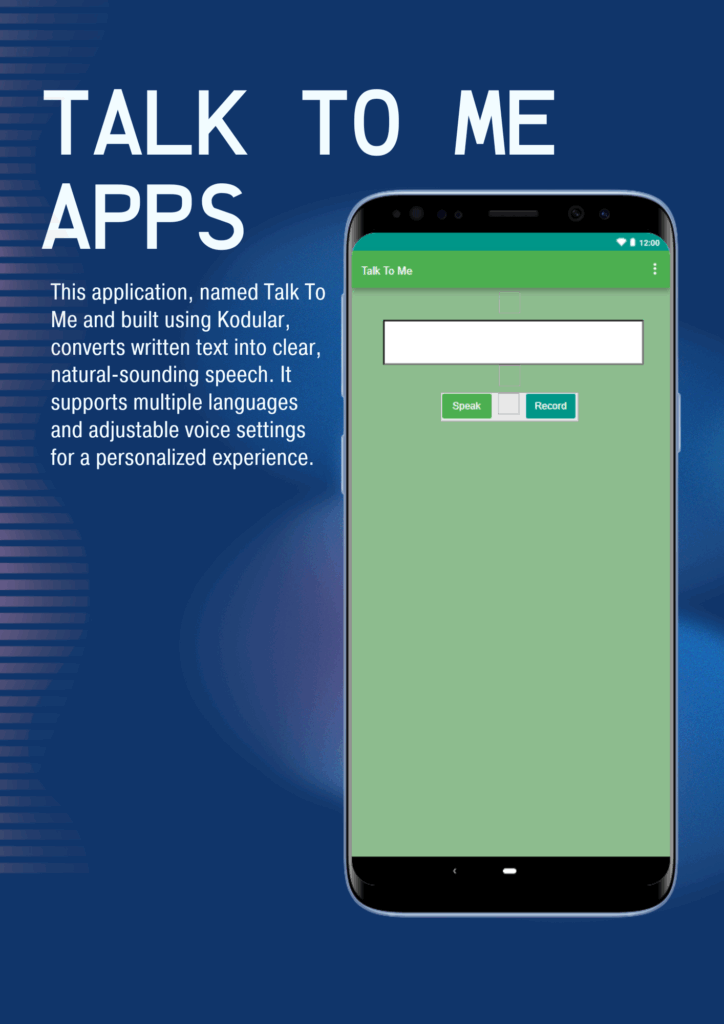 This application, named Talk To Me and built using Kodular, converts written text into clear, natural-sounding speech. It supports multiple languages and adjustable voice settings for a personalized experience. The app is designed for accessibility, learning, and productivity purposes. With its simple interface, users can easily turn text into audio anytime.