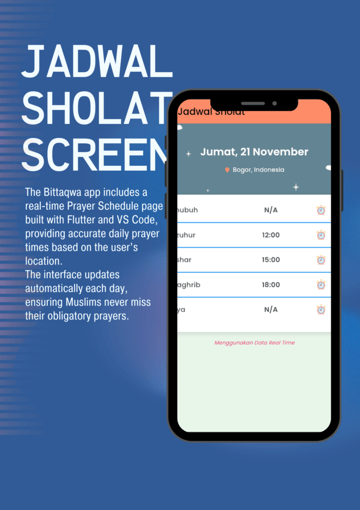 This video demo presents Bittaqwa, a modern Muslim lifestyle application developed using Flutter and Visual Studio Code, focusing specifically on showcasing its real-time Prayer Schedule page. The video begins by introducing Bittaqwa’s main purpose: providing Muslims with an accurate and continuously updated guide for performing their daily prayers on time. The narrator explains that the Prayer Schedule feature is designed to automatically synchronize with the user’s current location, ensuring that the displayed prayer times are always correct, regardless of where the user is.